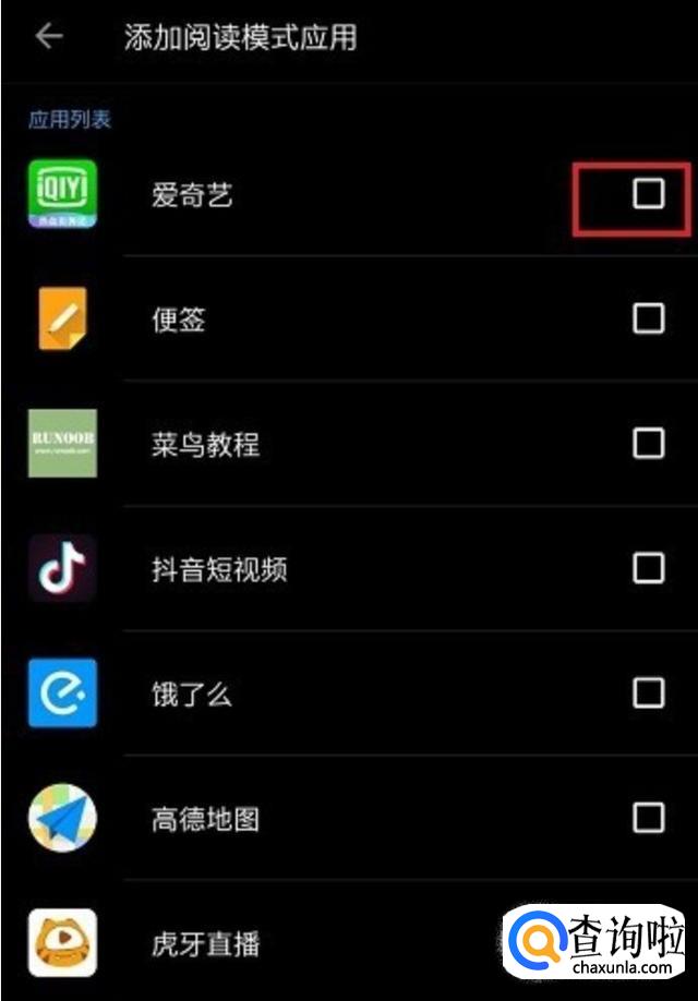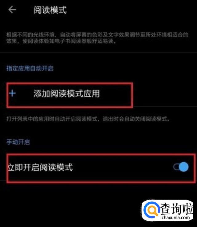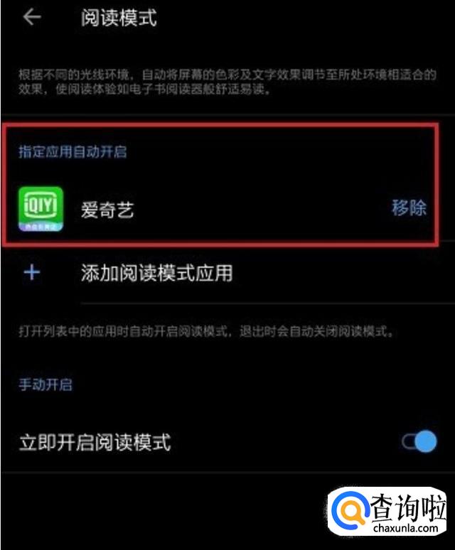 你可以单独手动选择某个应用开启阅读模式,点击【添加阅读模式应用】,然后选应用: