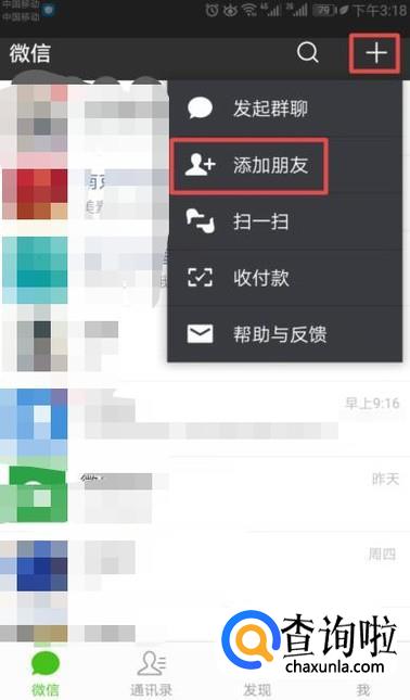 首先,我们打开我们的微信,然后我们点击右上角的添加,弹出的界面,我们点击添加朋友;