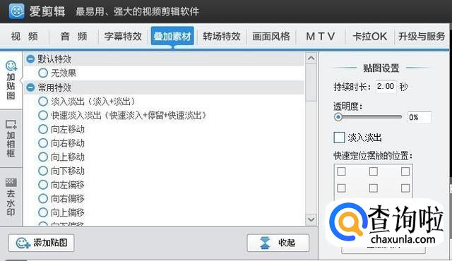 你还可以点击叠加素材,为自己的视频加上一些贴图和相框等。