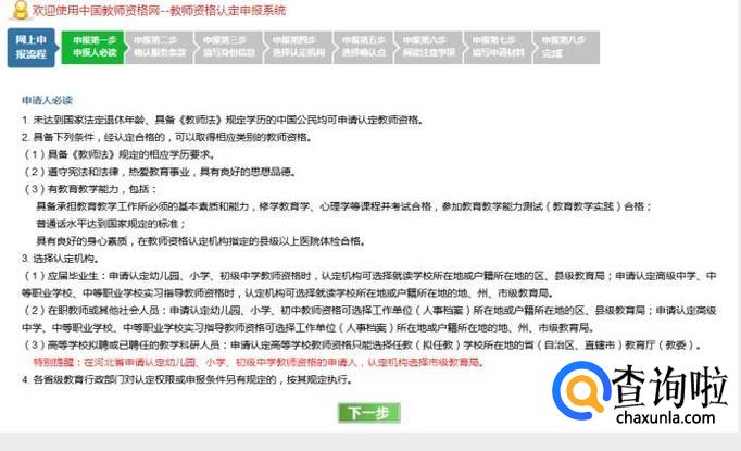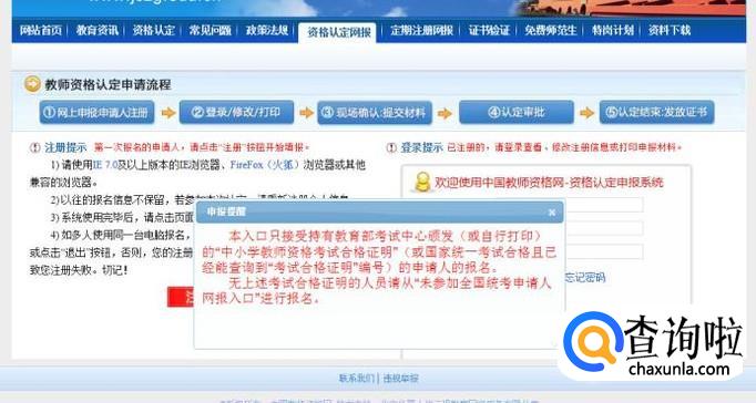 我们进入网上教师资格证认定申请系统后,看到这里有全套的教师资格证获取流程。我们需要用指定的IE 7.0及以上版本的IE浏览器、FireFox(火狐)浏览器或其他兼容的浏览器完成报名。