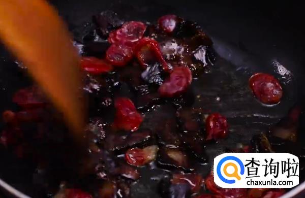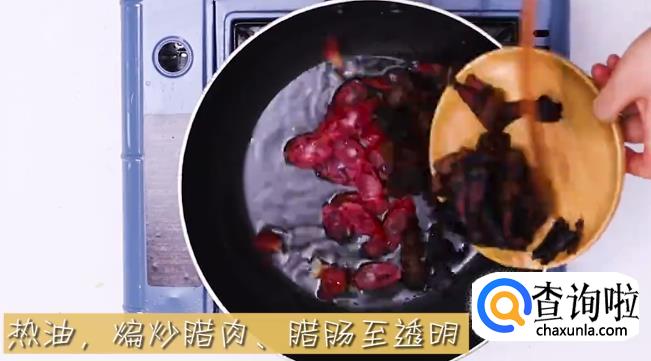 准备热油锅,爆炒香肠腊肉指透明。