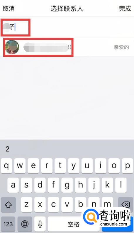 接着在搜索框搜索另一半,点击另一半的头像,再点击右上角的完成。