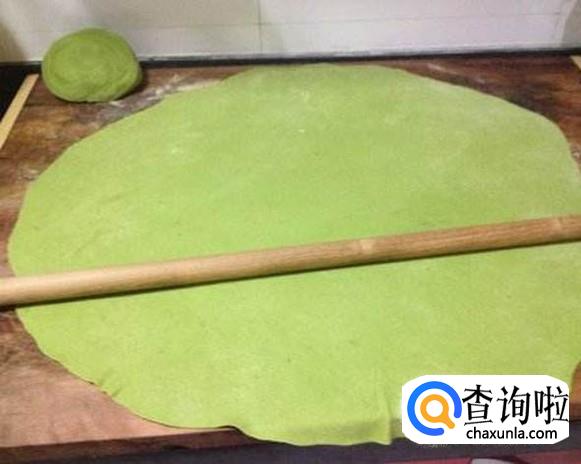 将醒好的彩色面团用擀面杖擀成厚度为0.3厘米左右的面饼,要尽量擀的均匀一些。