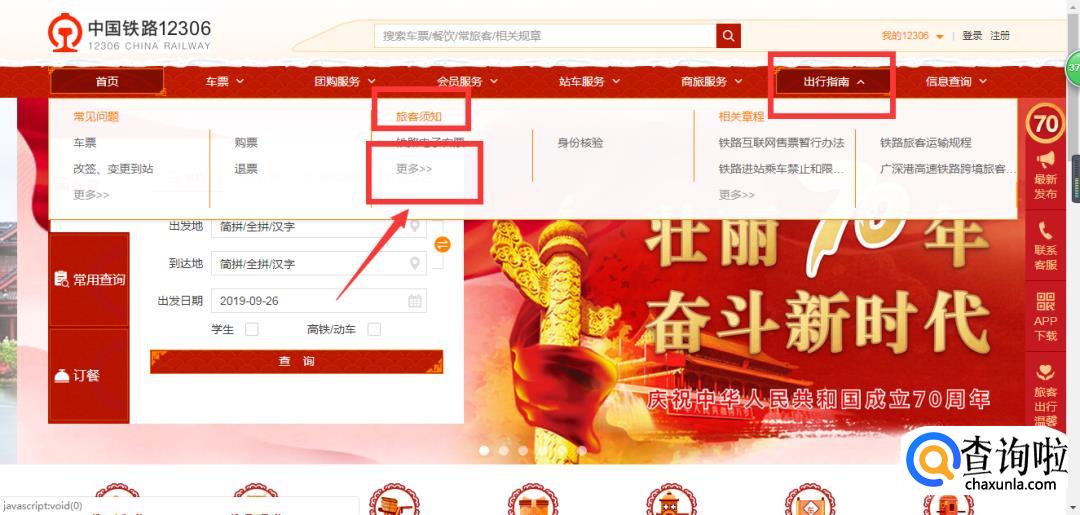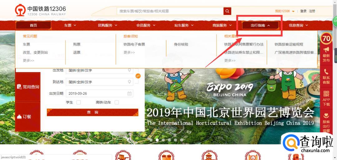 在12306网站页面中,将鼠标移至【出行指南】。