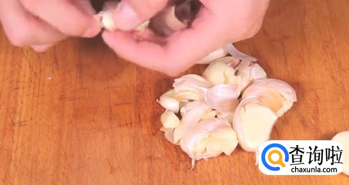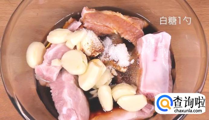 将剥好的大蒜放入浸泡好的排骨中,加入4勺生抽、1勺老抽、1勺白糖进行搅拌,腌制30分钟。