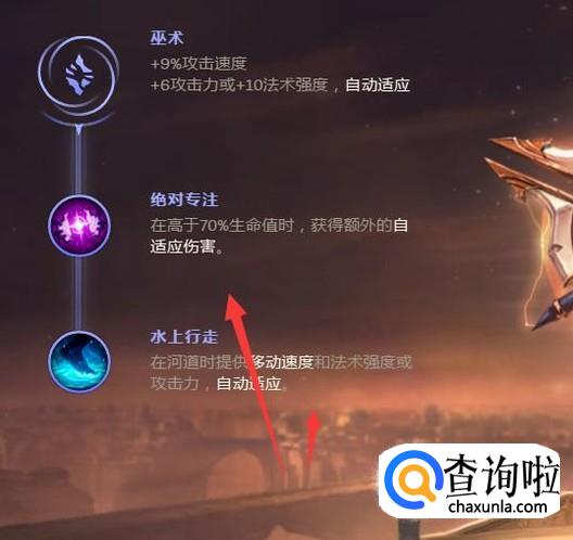 副系的选择比较多样,不过常规的选择是点巫术里面的水上行走以及绝对专注,这个符文对于卡密尔在野区交战所提供的伤害是不错的。