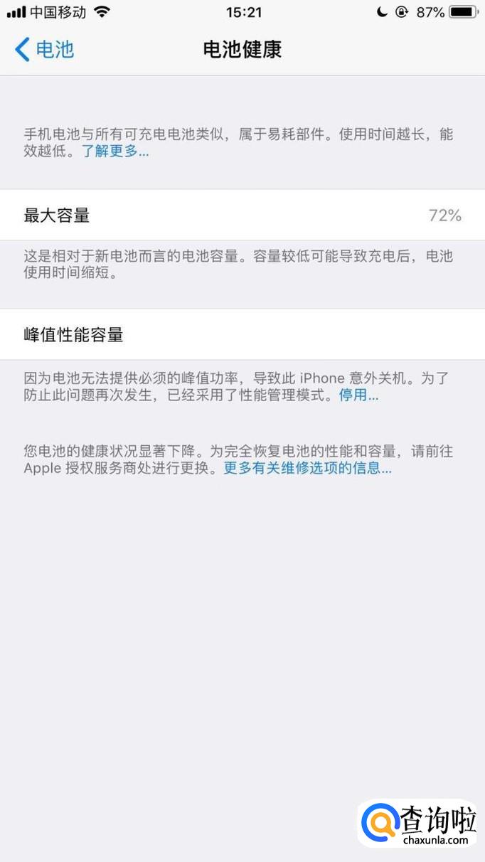 在这个界面我们就可以查看到我们苹果手机电池的最大容量和峰值性能容量了。你学会了吗?赶快动手试一试吧。