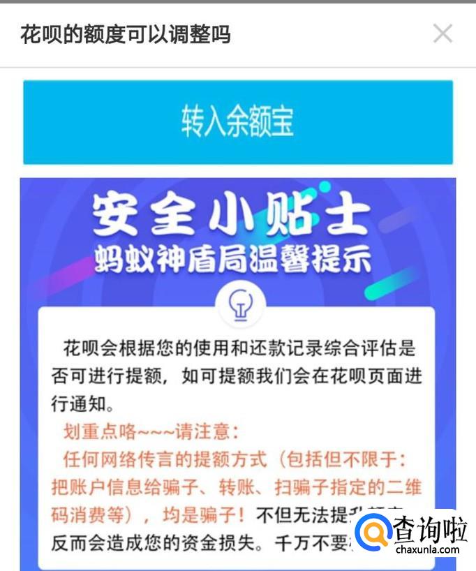 除了系统评估之后给的额度,花呗还会不定期的推出关于额度提升的活动,在推出活动的时候,多多注意额度提升哦!除此之外我们可以多使用花呗,以此来增加用户的活跃度,并且要保持良好的信用记录,按时还款,这样也可能增加花呗额度提升的可能性哦!