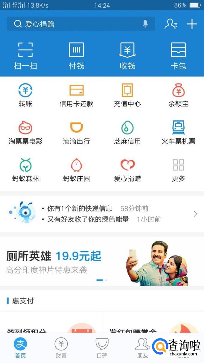 首先进入支付宝首页,找到“我的”,然后点击进入“我的”界面。