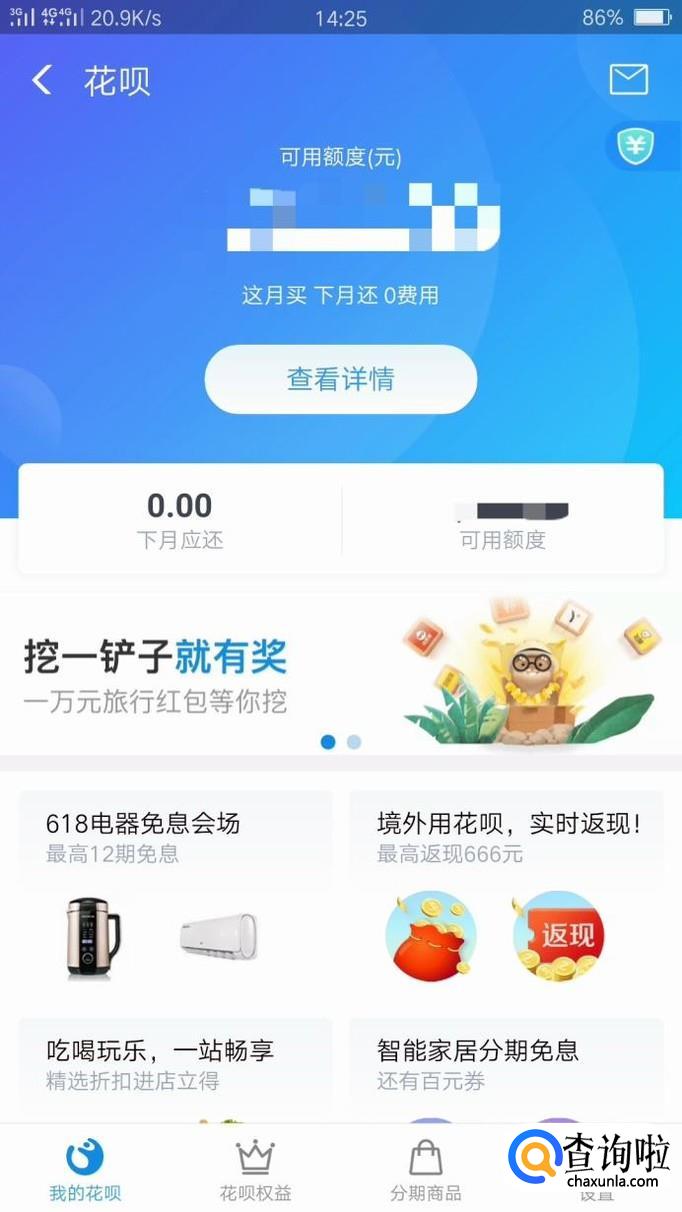 在“我的”界面有一个“花呗”,这里就是进入花呗详情的入口,点击进入吧!在花呗详情界面可以看到自己的额度,以及使用情况。