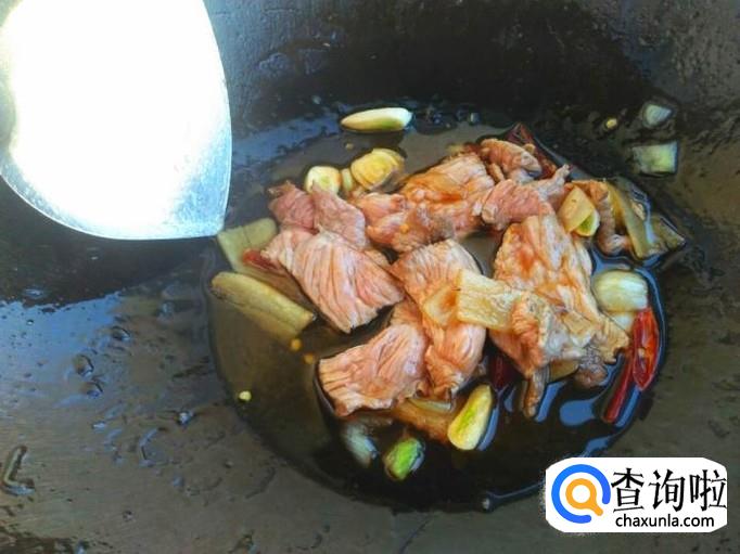 肉片切的特别薄,所以很快就炒熟了,将角瓜片倒进去。