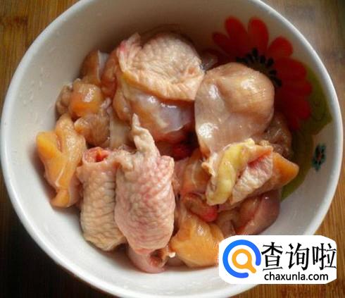 鸡肉洗净,砍成小块,加料酒,盐,老抽,淀粉腌制15分钟