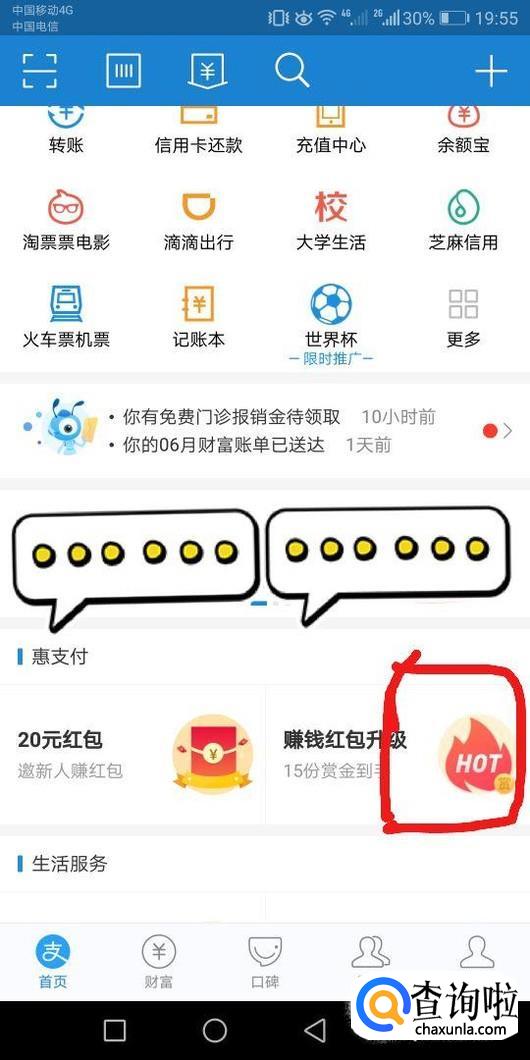 打开你的支付宝,往下滑动,界面有个赚钱红包升级,点击进入。