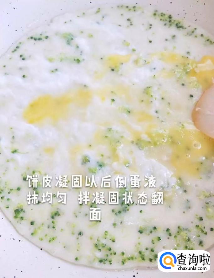 等到面饼凝固以后,倒入另外一半蛋液抹均匀,煎凝固,如下图所示。