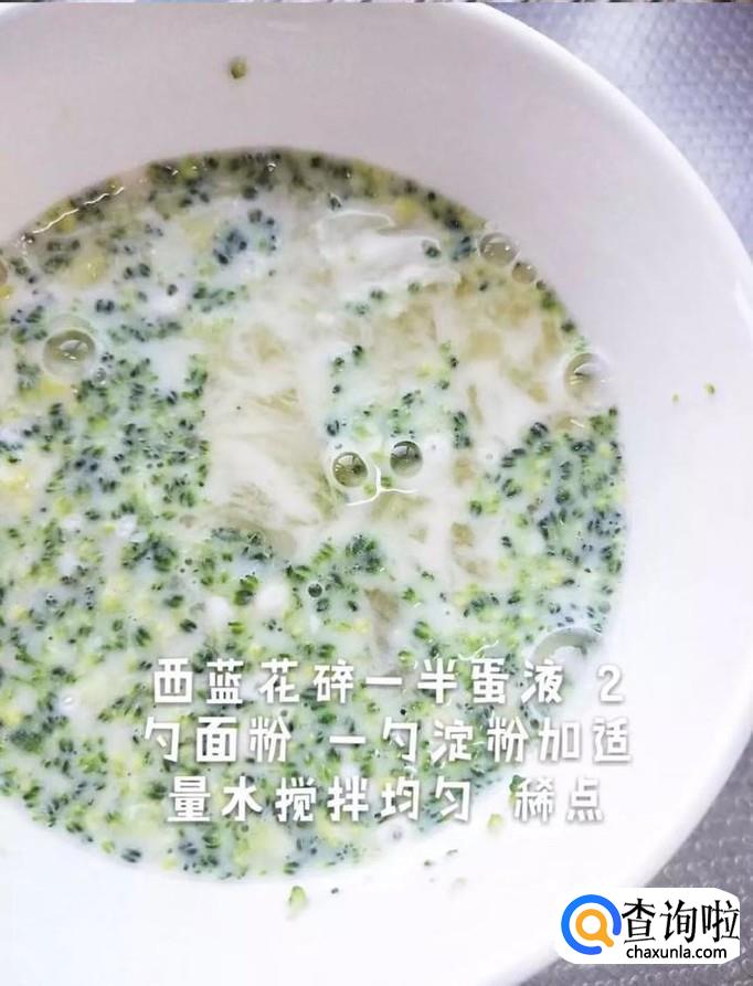 首先在一个碗内加入西兰花碎、一半的蛋液,、两勺的面粉、一勺的淀粉和适量的水,搅拌均匀,如下图所示。小贴士:搅拌的时候,最好搅拌稀一点会比较好。