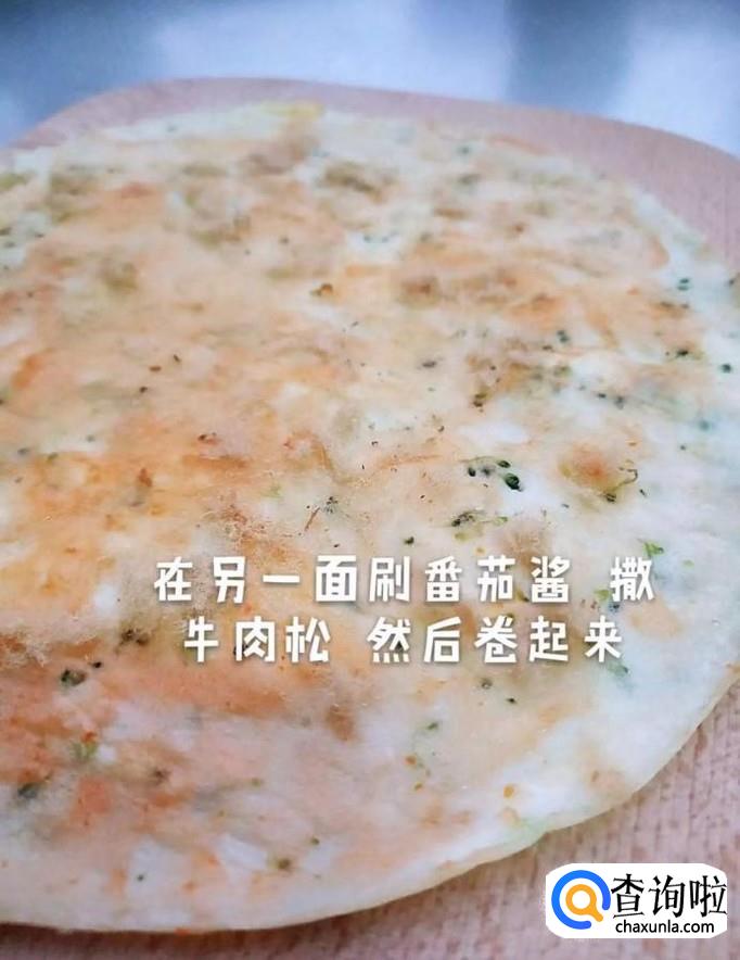 接着刷上番茄酱,撒上牛肉松,卷起来,如下图所示。