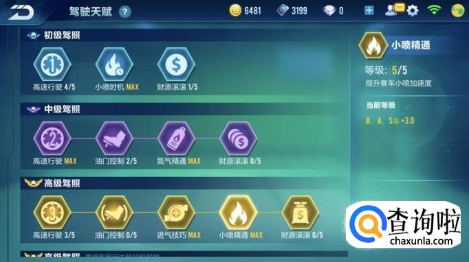 点击驾照说明,就可以看到不同驾照有何区别,点击天赋系统,就可以来到天赋系统,我们可以在这里升级天赋,来提升在赛道上的综合实力。如图