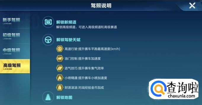 首先我们来了解一下驾照的作用,获得更高等级得驾照可以解锁更高难度的地图,并且可以提升驾驶天赋,驾驶天赋和改装赛车差不多,都可以提高速度,集气等属性。