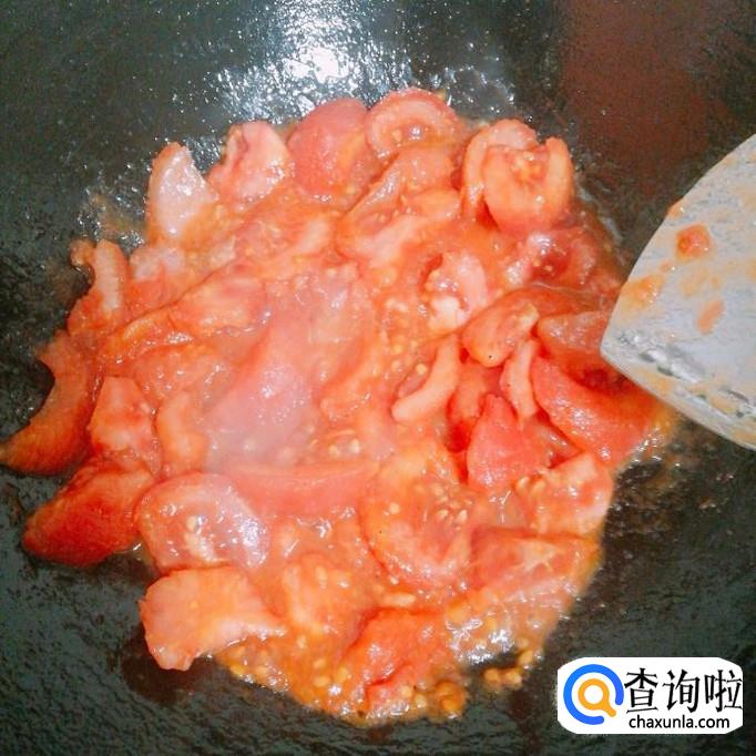 不停用铲子翻炒番茄,直至番茄出汁变软。