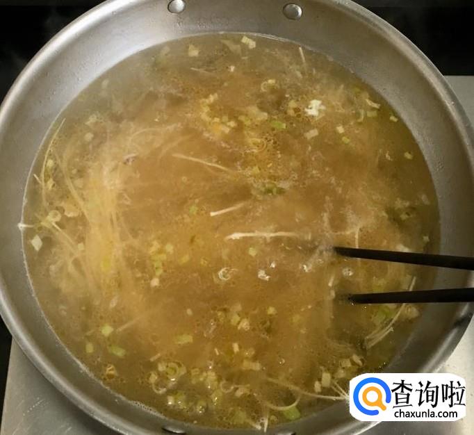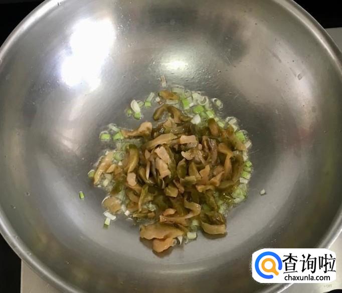 热锅加入适量的花生油放入葱花爆香,倒入备好的榨菜丝翻炒均匀后加入适量的清水