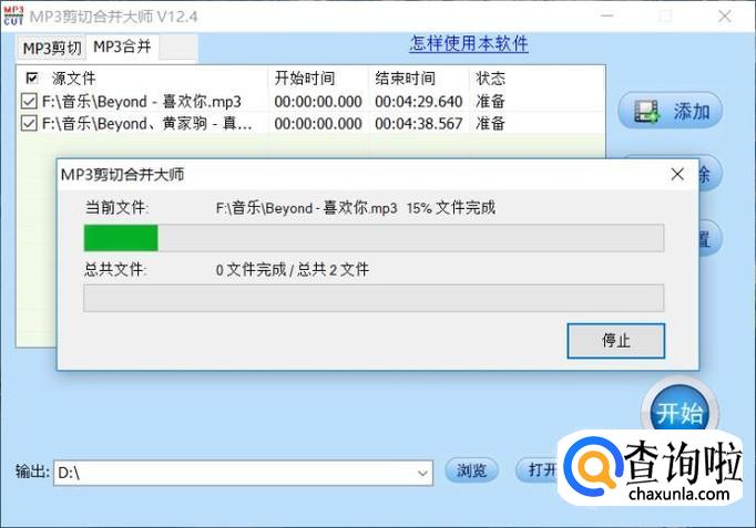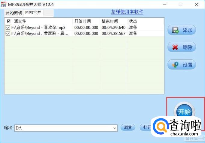歌曲文件选择完毕之后,点击软件主界面上的“开始”按钮即可开始歌曲文件的合并操作。