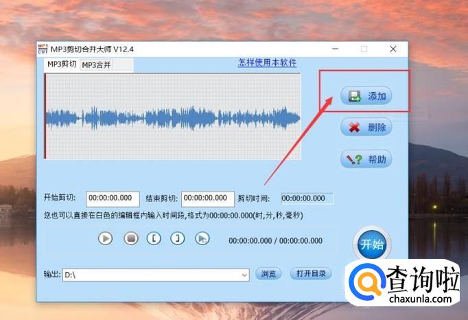 首先,我们打开MP3剪切合并软件,在软件主页面中可以看到剪切和合并功能,这里我们先点击“剪切”功能,点击添加要剪切的歌曲文件。