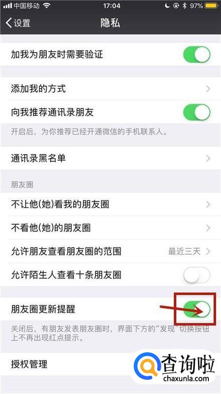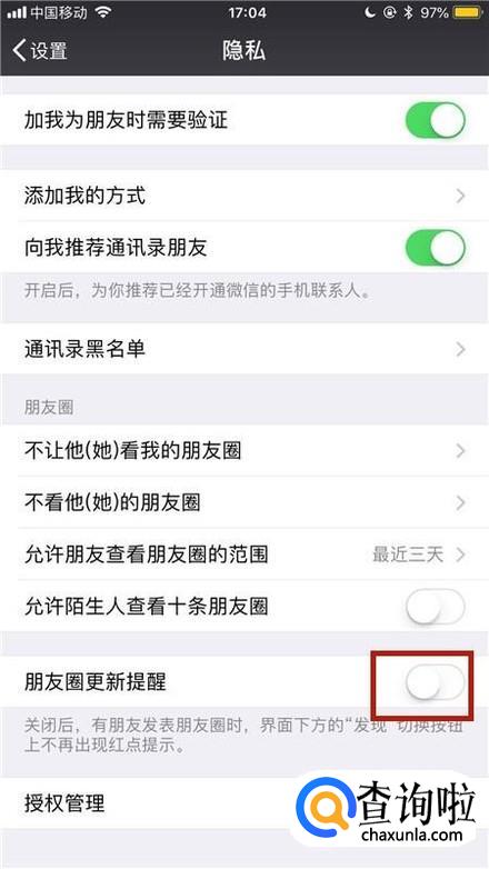 接着点击关闭朋友圈更新提醒开关,如下图所示。