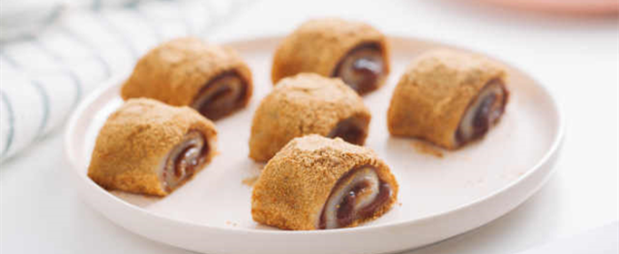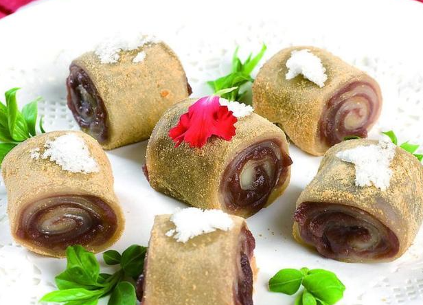 “驴打滚”的原料有大黄米面、黄豆面、澄沙、白糖、香油、桂花、青红丝和瓜仁。它的制作分为制坯、和馅、成型三道工序。做好的“驴打滚”外层粘满豆面,呈金黄色,豆香馅甜,入口绵软,别具风味,豆馅入口即化,香甜入心,黄豆面入嘴后可以不嚼,细细品,是老少皆宜的传统风味小吃。