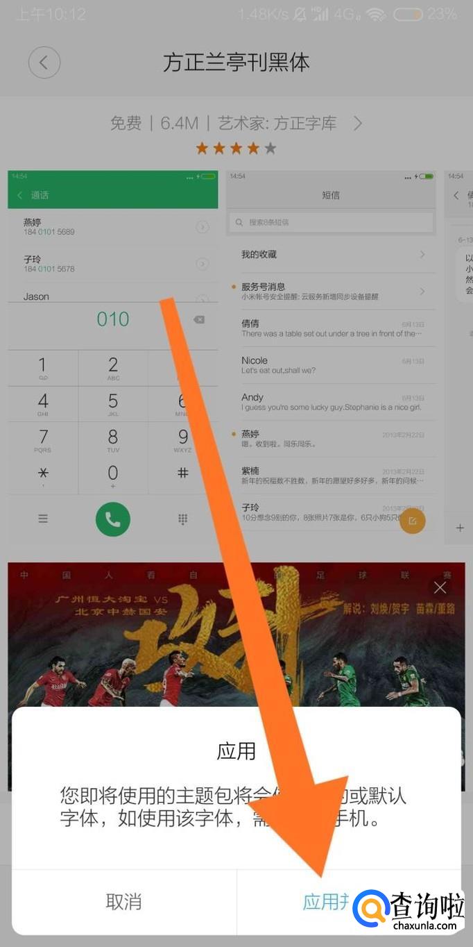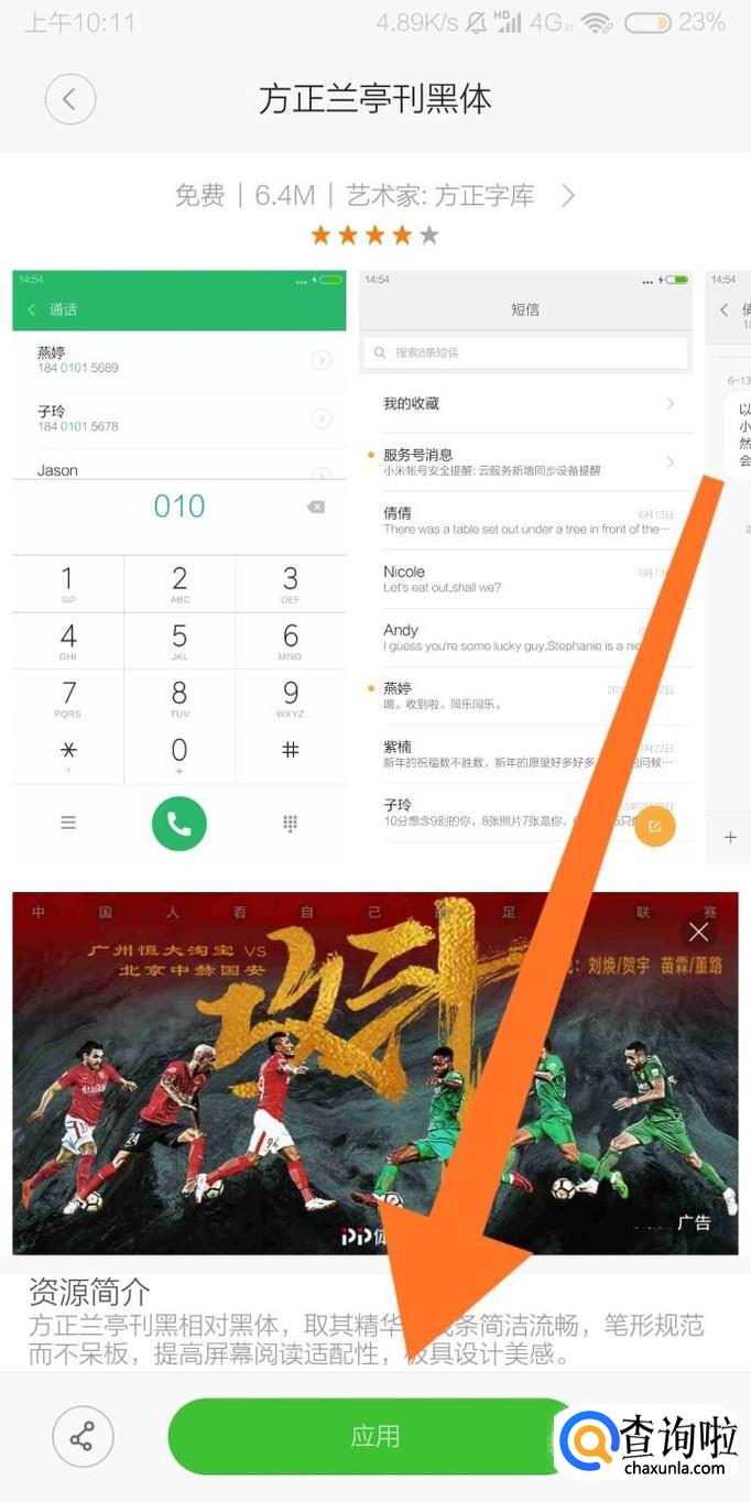 进入字体详情页面后,点击底部绿色的“应用”按钮即可使手机应用该字体。在应用新的字体过程中,手机需要重新启动。