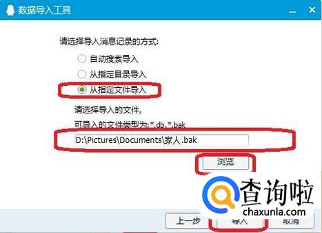 然后选择“从指定文件导入”,通过点击“浏览”找到当初保存聊天记录的文件夹,然后“导入”即可。