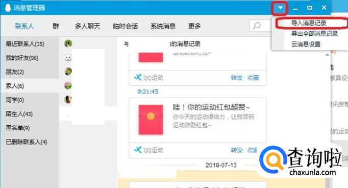 要还原聊天记录,我们只需要点击“消息管理器”窗口右上角的倒三角图标,选择“导入消息记录”就可以了。