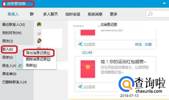 在“消息管理器”窗口,右键点击朋友的名字,弹出菜单,选择“导出消息记录”。
