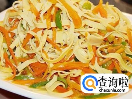 素三丝:豆腐皮、辣椒、胡萝卜都切成丝,锅内热油后加入调料爆炒,出锅前加点水淀粉勾芡即可。