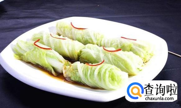 翡翠玉卷:把香菇、胡萝卜、竹笋都切成细丝后加入生抽、盐、糖一起爆炒后装盘;然后把白菜叶用热水烫软;再用烫好的白菜叶把香菇丝等包住后撒上少许盐和胡椒粉上锅蒸8分钟左右就可以了。