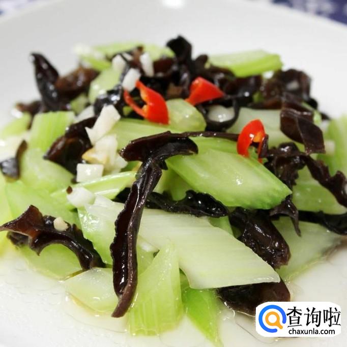 木耳炒芹菜:木耳提前泡发好,然后洗净后揪成小块,芹菜洗净后切成小段;锅内热油,用姜蒜爆锅后放入芹菜段翻炒,然后放入木耳,再放少许生抽、盐、料酒调味,装盘后撒上点熟芝麻就可以了。