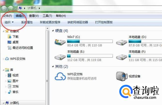 在弹出的窗口中点击【组织】,在弹出的下拉菜单中选择【文件夹及搜索选项】,如下图所示: