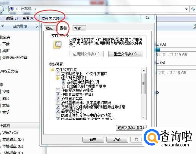 在弹出的【文件夹选项】中切换到【查看】选项卡,如下图所示: