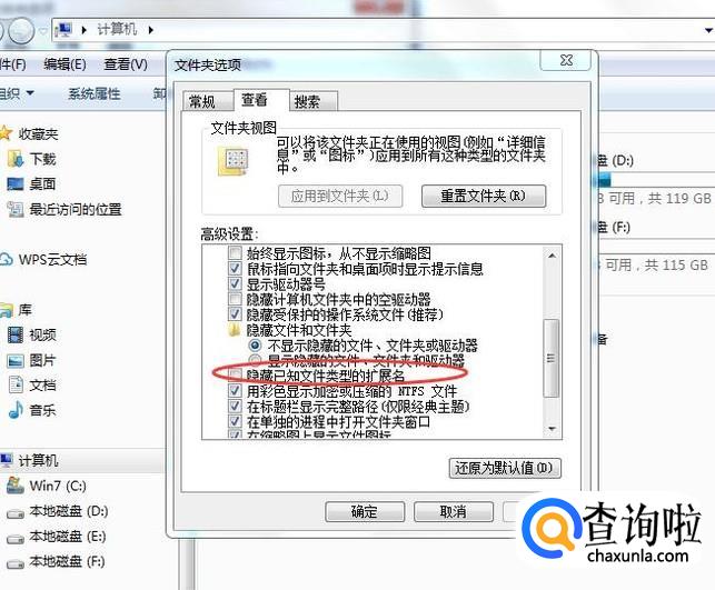 找到【隐藏已知文件类型的扩展名】选项,如果选中的话,则文件扩展名就不会显示了,如下图所示: