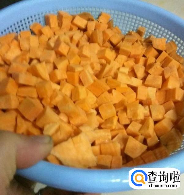 首先将红薯洗干净,把红薯皮削干净,在菜板上切成小粒状