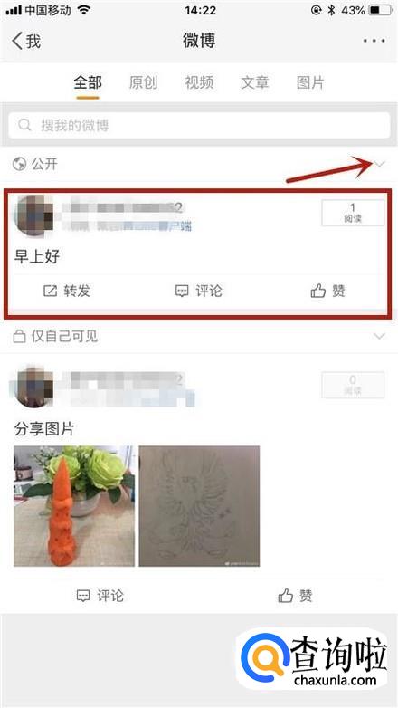 然后选择要置顶的微博文章并点击上方的三角形,如下图所示。