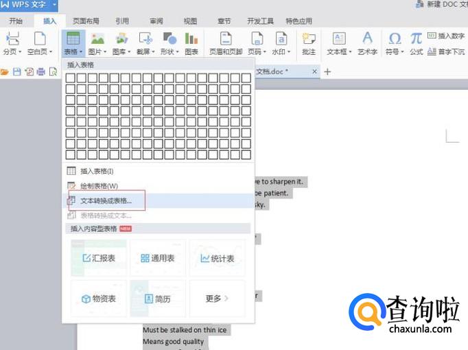 选择插入,表格,文本转成表格,如下图所示