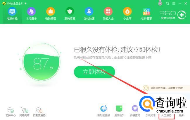 打开杀毒软件,在杀毒软件的界面里找到“人工服务”,鼠标点击进入。