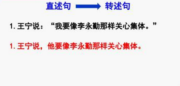 转述句改法是先修改标点符号,先把双引号去掉,然后把冒号改成逗号。修改第一人称,如果在句子里出现第一人称,把第一人称改成第三人称,修改第二人称,把第二人称改成第一人称,把冒号前的人名代入引句的人称那里,当转述句中出现一些人物时,不能单单修改人称,还要把人称修改成指代的人物,以免出现混淆不清的情况,并且可以加上一些词让句子变得通顺。修改指示代词,同时也要注意趋势词“来”和“去”的改变。