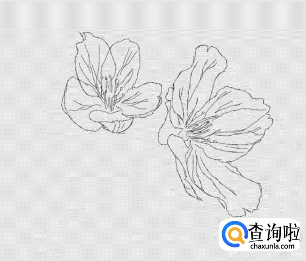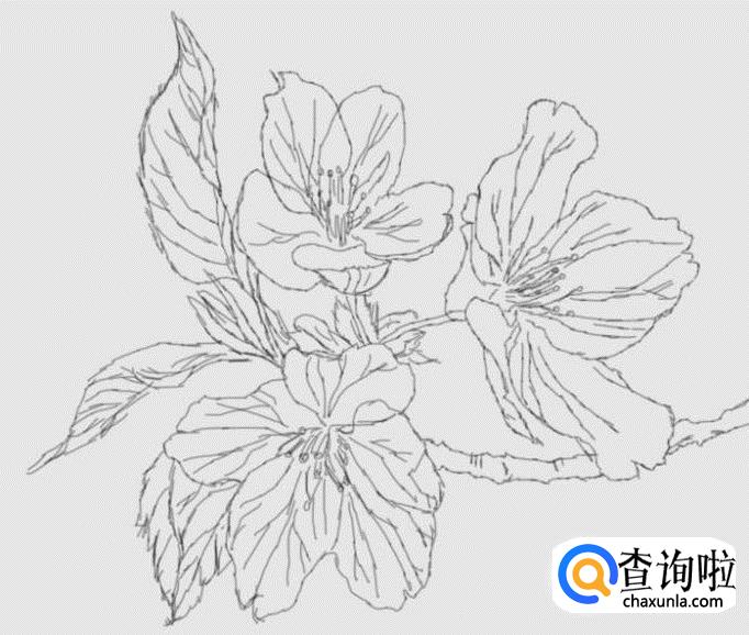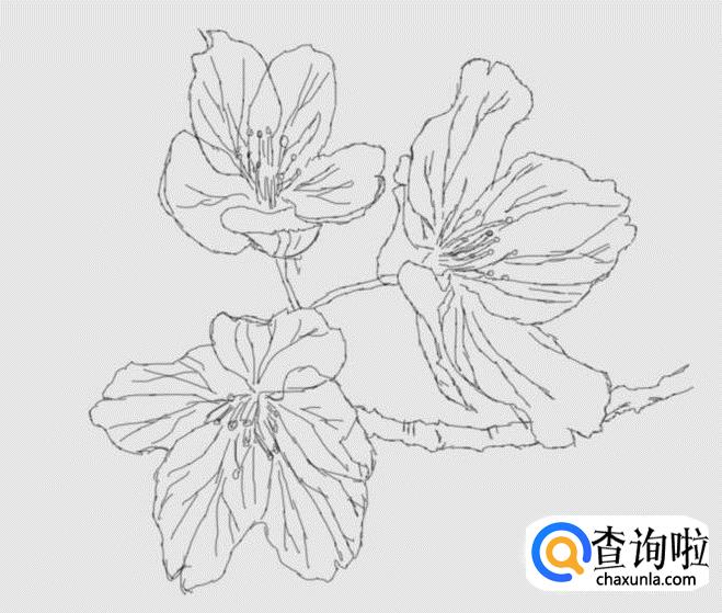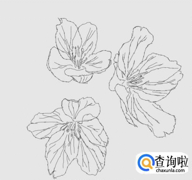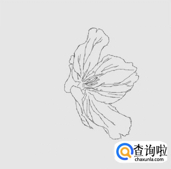 在这多樱花的轮廓上我们画出樱花的纹理、花心及花蕊,如图所示: