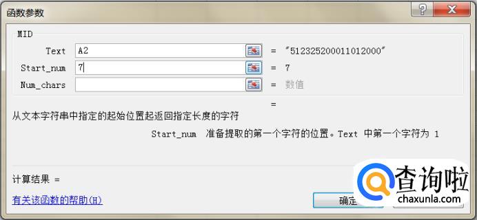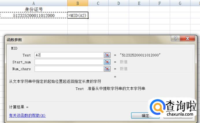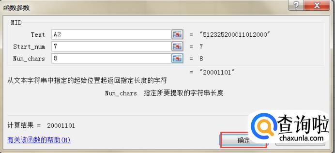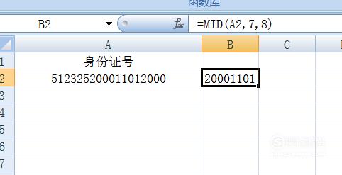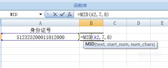 点击插入函数,找到MID函数,在弹出的对话框中,第一个参数框中输入A2,第二个参数框中输入7(因为是从身份证第7位开始提取数字),第三个参数框中输入8(总共提取8位数字),输入完成后点击确定。