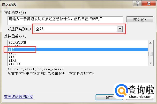 在弹出的对话框中的“或选择类别”选择“全部”,在选择函数的地方找到MID函数,点击确定。