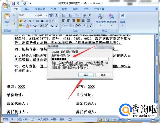 弹出确认密码的对话框,我们再次输入密码,点击确定。这时候文档就加密了。