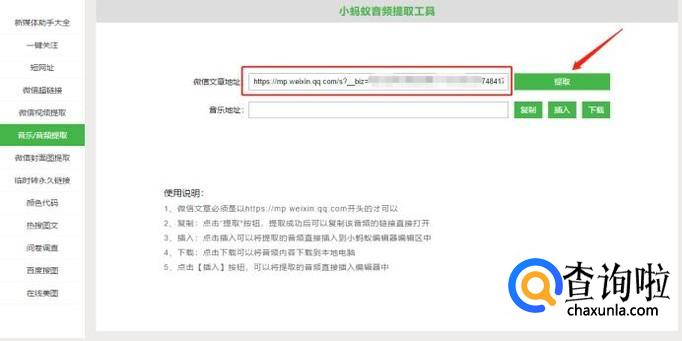 第二步:将上述获取的地址填入“微信文章地址”框中,点击提取按钮。