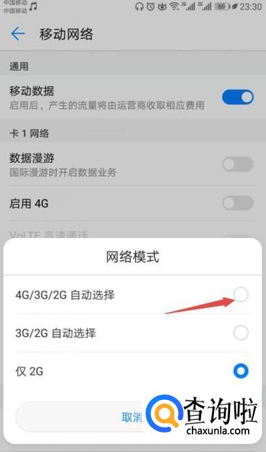 弹出的界面,我们点击4G/3G/2G自动选择;