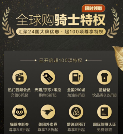 全球购骑士卡由广州探途网络技术有限公司推出,是国内首张以“骑士”来命名的汇聚海内外购物折扣、会员专属特权的综合权益卡。集合了依托于境外游的数百项全球购物特惠,以及在国内的尊享特权,涵盖出行、美容、餐饮等。特权涉及境外游的各个方面,包括出行、住宿、购物、玩乐、饮食、以及增值服务。